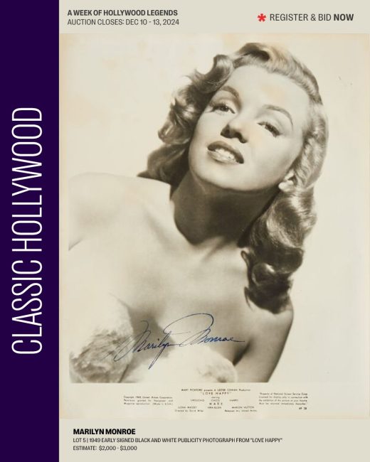 This J.R. Eyerman publicity shot for Love Happy (1949), with Marilyn’s autograph in blue ballpoint pen, is described as “very neat and legible from her early starlet days … her later ‘movie star’ signature became loopier and less concise.”