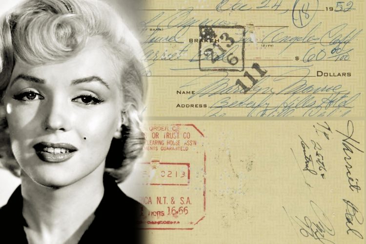 A $60 Bank of America cheque signed by Marilyn to Harriet Beale, her dresser at Twentieth Century-Fox, on Christmas Eve, 1952. Marilyn often asked Harriet to autograph her fan pictures, and once sent her shopping for a white fox scarf. “I loved her,” she recalled in 1974.