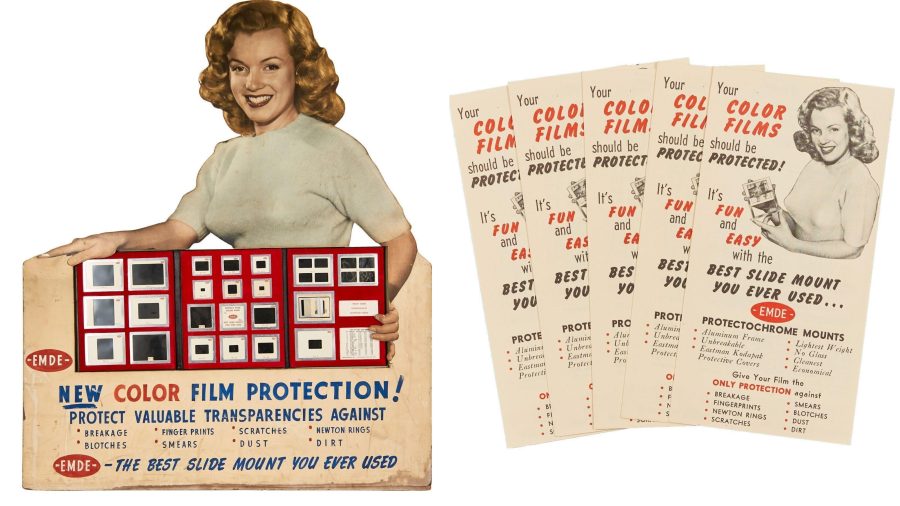 Among the other Marilyn-related highlights is this plywood standee made as an in-store display promoting mounts for colour film slides and transparencies made by the noŵ-defunct Emde Products of Culver City, and featuring an image of the young Norma Jeane Dougherty photographed by William ‘Bill’ Carroll circa 1946. And sold separately, a set of five identical pamphlets promoting Emde Mounts.