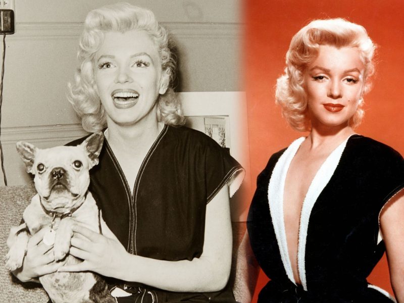 This rare sepia outtake from a 1953 colour photo shoot with Frank Powolny shows Marilyn hugging a French bulldog.