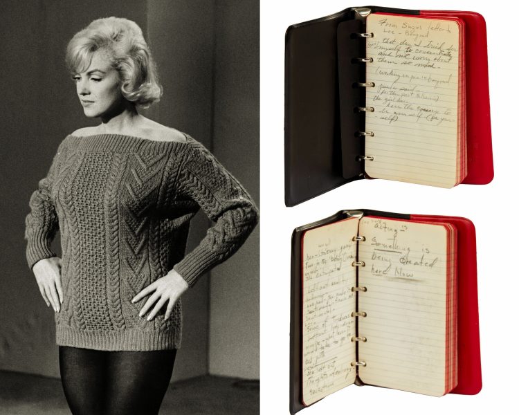“A small six-ring binder containing lined notebook pages in a black and red vinyl case by National that belonged to Marilyn Monroe. The small notebook contains 10 pages of notes in Monroe’s hand, in pencil, on eight leaves of paper. The notes were taken during a class with Lee Strasberg and record bits and pieces of things that ‘Lee said,’ as is repeated on many pages, which include ‘For yourself not for us – or one doesn’t use own sensitivity/ girl crying continuously /Lee said – There should be a certain pleasure in This, in acting – we don’t stop these things – she stoped [sic] crying only at those times’; ‘problems-all the more to be solved got to keep swimming/ criticism can be taken – to incite the will not self criticism’; ‘the actor has to do what the character has to do – let the author worry about his words’; ‘Life of – reality of champagne (you don’t open every bottle the same) actor in scene took for granted (girl is going to be good (New). Boy – said lines no effort – like crossing street – Lee said he wants – Behavior – When someone is trying to make someone (love etc.) how does one go about it/ Lee said – girl simplicity good honesty, to begin (New) with – but…’ The last notes are taken on two sides of one leaf of paper and read ‘My heart Belongs To Daddy Number/ Remember always left -‘ and ‘While tearing off/ caddy-move head a little/ Daddy R. shoulder up/ call dog in closer’; clearly, these notes are for Monroe’s musical number in Let’s Make Love (1960). The notes correlate with the lyrics of the song, and indeed Monroe does move her head a little during the first verse that mentions the caddy, and she does raise her right shoulder up the first time she says ‘Daddy’ in the chorus.”