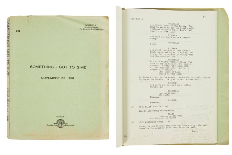 “Screenplay for Something’s Got to Give, dated November 22, 1961, by Arnold Schulman; Monroe pencilled notes to herself throughout the script on approximately 35 pages; most relate to her character’s dialogue, but a few are about the infamously troubled production; her ‘notes to self’ on the title page read in part: ‘New producer how come? / not a story for MM / it’s for a man and just any two girls / why was the writer who wrote it let go;’ on page 69, Monroe outlines what she wants to do in the scene: ‘newly learned / playing a record player and she does a twist and at certain beats in time with the music she bumps her hip against the wall;’ on page 87, her short note reads in part ‘her bed is not a hotel room;’ on page 126 she writes ‘not funny’ next to a line of double entendre; on page 131 she writes ‘Not a good speech / sick’ about another risque part; she finishes her annotations on page 138, the last page, with ‘NO NO NO’ — evidently an ending she did not like; this is just a small sampling of Monroe’s notes seen throughout the script.”