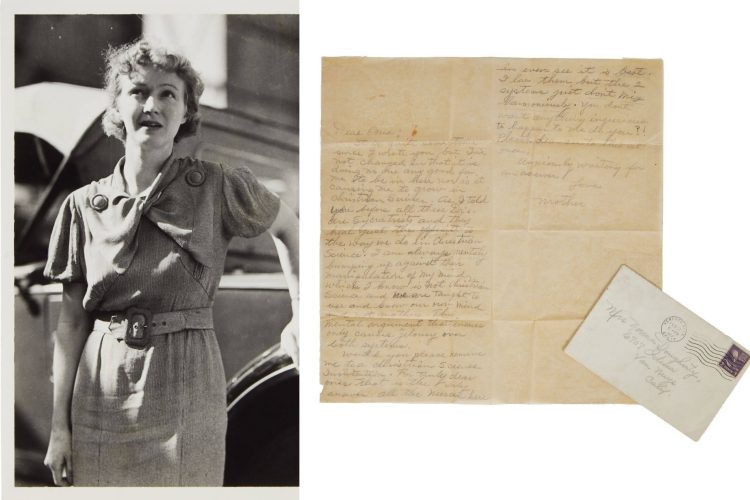 “A 1954 letter from Marilyn’s mother Gladys Eley [uusing her third husband’s last name], addressed to ‘Dear Ones’ [Marilyn and Eleanor ‘Bebe’ Goddard, Gladys’ best friend’s step-daughter]; a sad letter where Gladys outlines her unhappiness at the Rockhaven Sanitarium in Verdugo City, CA (now La Crescenta-Montrose, CA); she writes in part ‘I am always mentaly [sic] bumping up against their manipulation of my mind / which I know is not Christian Science / and we are taught to use and know our own mind;’ she ends with ‘Would you please remove me…You don’t want anything injurious to happen to me do you?! Please dear see to this at once. Anxiously waiting for an answer. Love Mother;’ included is the original transmittal envelope postmarked in part ‘Feb 2 1954’ and penciled to ‘Miss Norma Dougherty / 6707 Odessa / Van Nuys / Calif.’ — even though the 27 year-old star had not lived at that address for years and she was no longer using that name; Gladys’ return address (showing it was sent from Rockhaven) is penciled on the verso.”