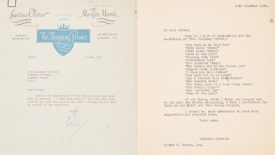 Papers related to The Sleeping Prince, the film’s original title, including a list of alternate titles sent by Olivier to Marilyn’s business partner, Milton Greene; and a silver chalice with an engraved lid that reads ‘The Sleeping Prince 1956.’