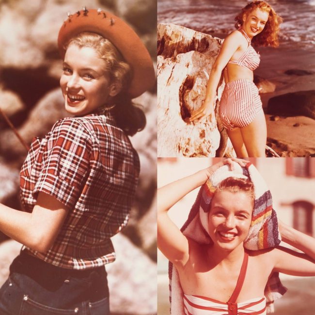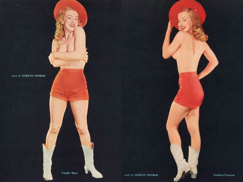 In these colour prints from another 1948 sitting with Willinger – likely pulled from a pin-up magazine – with Marilyn striking two ‘cowgirl‘ poses, labelled ‘Caught Short’ and ‘Southern Exposure.’