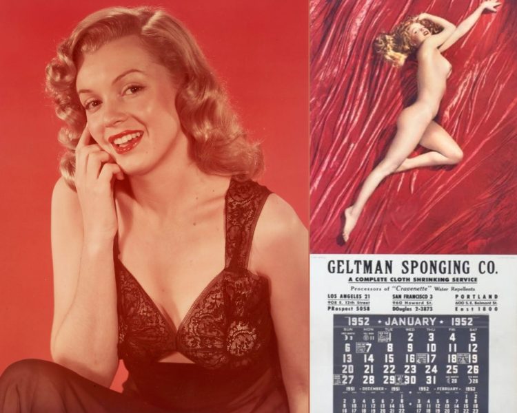 A 1948 portrait by Laszlo Willinger, in a 1970s print; and a 1952 calendar for Geltman Sponging Co. featuring Marilyn’s ‘A New Wrinkle’ pose from her 1949 session with Tom Kelley.