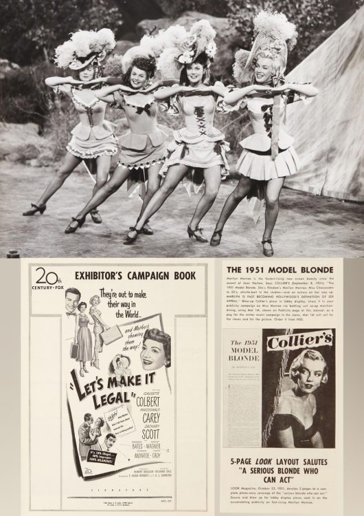 A still photo showing Marilyn with her fellow chorus girls A Ticket to Tomahawk (1950); and an exhibitor’s campaign book for Let’s Make It Legal, hailing Marilyn as the ‘1951 Model Blonde.’