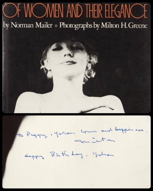 A first edition hardback copy of Norman Mailer’s Of Women and Their Elegance (1980), with this handwritten inscription from Milton Greene: ‘To Peggy & Yoram / Love and Happiness / Milton / Happy Birthday, Yoram’ — the addressee being Yoram Kahana, a longtime journalist and member of the Hollywood Foreign Press Association.