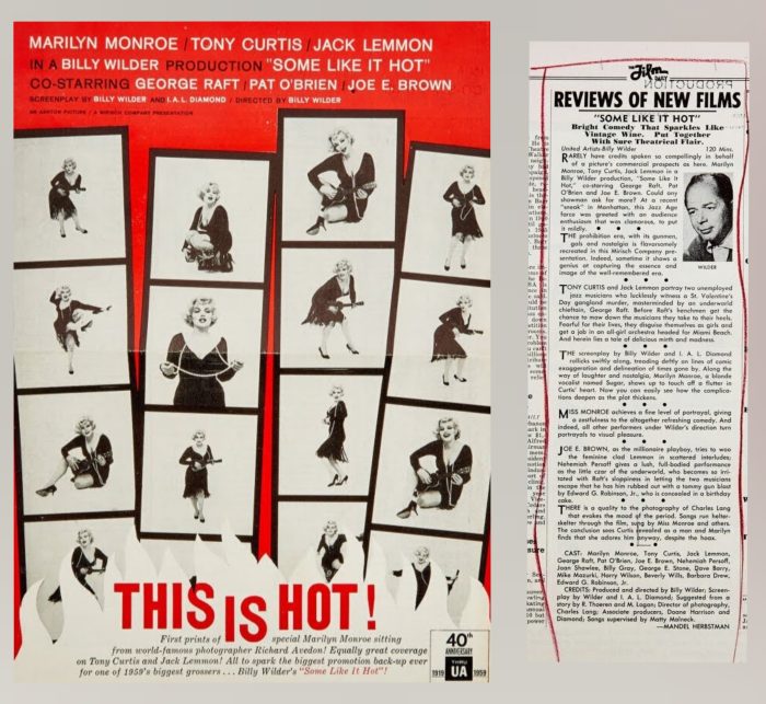 Marilyn’s personally owned Film Daily magazine, dated February 25, 1959, featuring a review of Some Like It Hot and promotional photos by Richard Avedon. ‘Miss Monroe achieves a fine level of portrayal, giving a zestfulness to the altogether fresh comedy,’ wrote critic Mandel Herbstman.