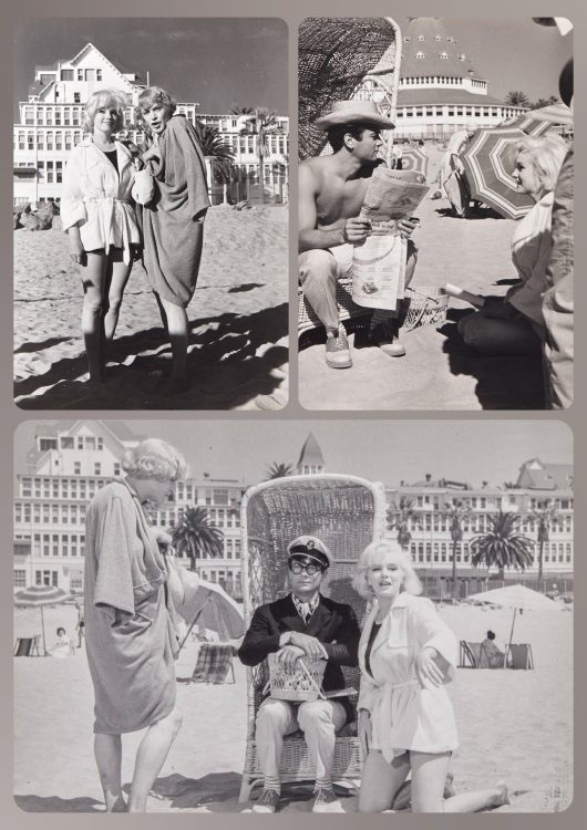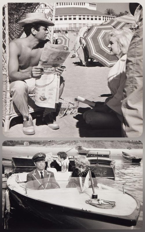 Marilyn and Tony Curtis in one of three images shot on location for Some Like It Hot; and shooting the final scene with co-stars Jack Lemmon and Joe E. Brown (sold separately.)