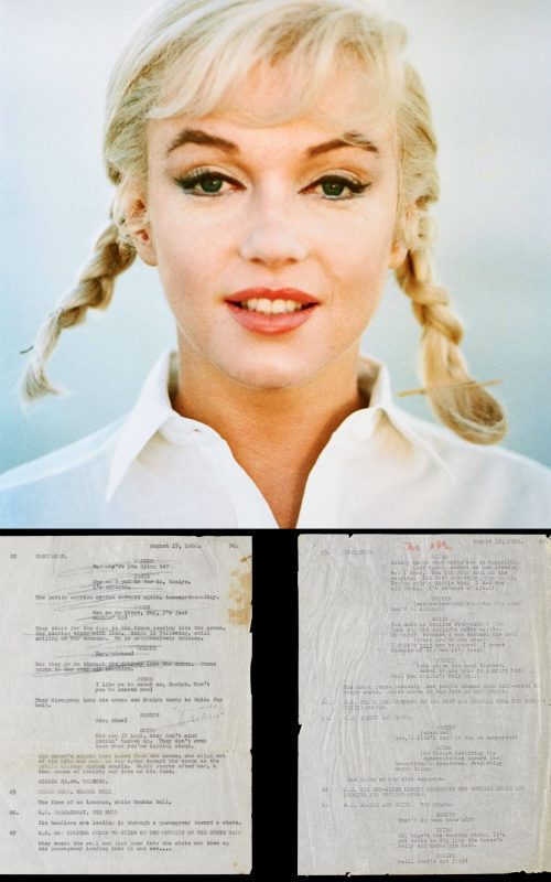 Marilyn photographed by Eve Arnold in 1960; and a single page of dialogue for The Misfits, dated August 17, 1960, with pencilled cross-outs for her character ‘Roslyn’ as well as her ‘note to self’ reading ‘Try to make / Guido Relief’ [sic], another penciled annotation in upper right corner in someone else’s hand reads ‘May Reis’s’ [Marilyn’s secretary]; on the next an orange wax pencil annotation of ‘MM’ in the upper margin, though no other annotations appear.