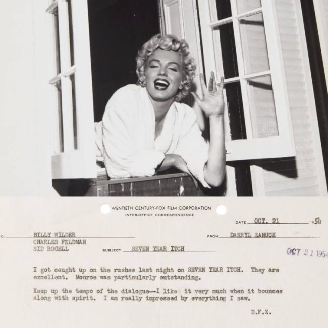 An original print of Marilyn on location for The Seven Year Itch in New York; and a memo from Darryl F. Zanuck, head of Twentieth Century-Fox, dated October 21, 1954 and addressed to director Billy Wilder et al, reading in part, ‘I got caught up on the rushes last night on Seven Year Itch. They are excellent. Monroe was particularly outstanding.’