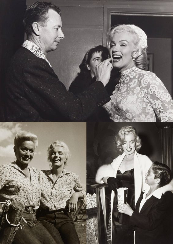 Marilyn and her makeup artist, Allan ‘Whitey’ Snyder, on the set of Gentlemen Prefer Blondes; on location for River of No Return with her stand-in, Helen Thurston; and with Tommy Rettig, her River co-star, at a premiere in 1953.