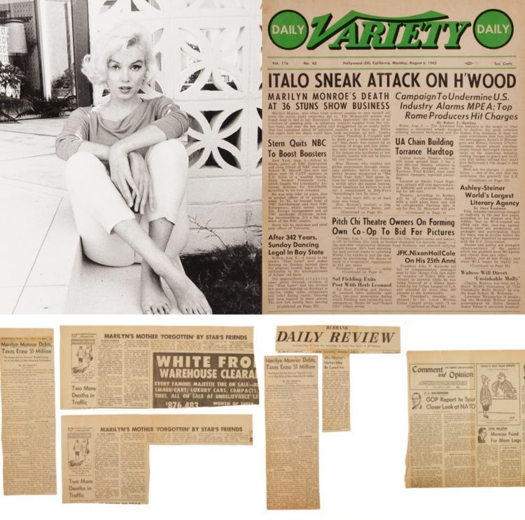 And finally, one of four prints from a George Barris portfolio; a copy of Variety dated August 6, 1962, with Marilyn’s death announced on the front page; and a group of newspaper clippings from the Los Angeles press circa 1965, reporting on legal issues over Marilyn’s estate and the fate of her mother.