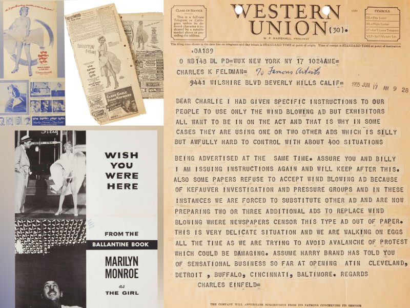 A rare herald sample sent to cinema owners for display; two newspaper clippings from June 1955, related to the film’s release; an advertisement for the tie-in book, Marilyn Monroe as The Girl; and a telegram sent to Charles Feldman by a Fox studio executive regarding the publicity campaign (‘some papers refuse to accept wind blowing ad … this is a very delicate situation …’)