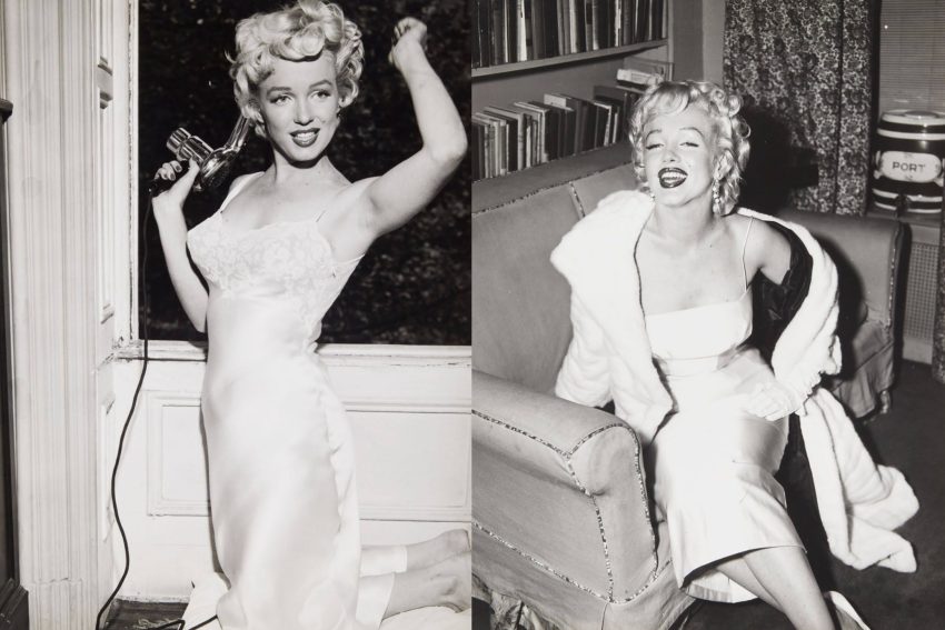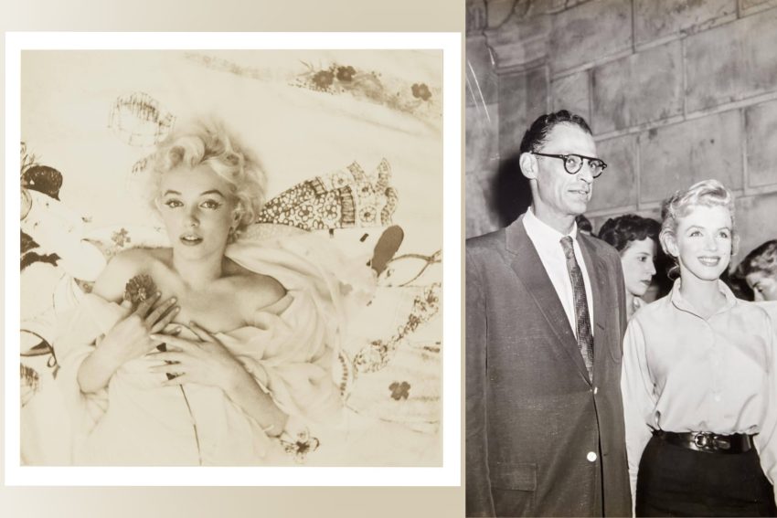 At left, an original print of Marilyn’s favourite Cecil Beaton photo from 1956, one of many copies she had made to sign for special people in her life; and at right, Marilyn with Arthur Miller outside her Sutton Place apartment building on June 22, 1956, as they announced their engagement to the press.