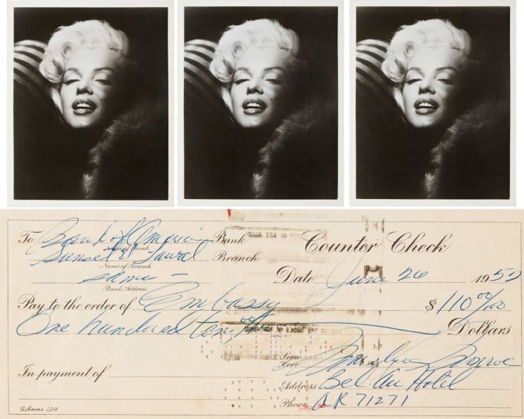 Six 1970s prints of a 1953 portrait by Frank Powolny; and a handwritten cheque dated June 26, 1952, and signed ‘Marilyn Monroe, Hotel Bel Air’.