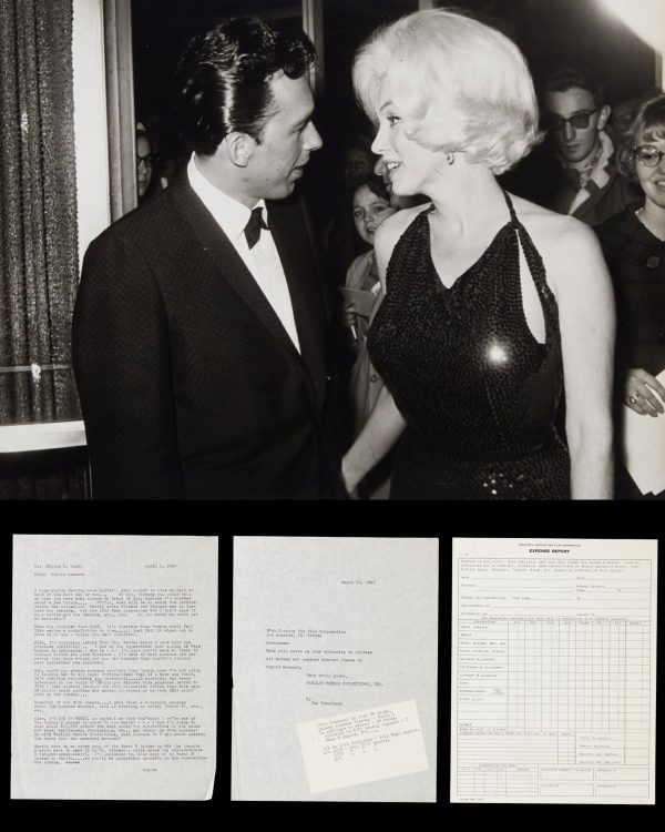 Marilyn with Mexican screenwriter Jose Bolanos, her date for the evening, at the Golden Globe Awards on March 5, 1962, when she was named World Film Favourite; and one of four miscellaneous files – a typed letter from secretary Cherie Redmond to Marilyn’s attorney, dated April 2, 1962, outlining concerns about Marilyn’s finances and business ventures, including a funny situation about a recipe she was going to contribute to a cookery book. Redmond writes ‘I’d hate to have someone use her recipe then turn around and sue her because they couldn’t stomach some ingredient she included.’