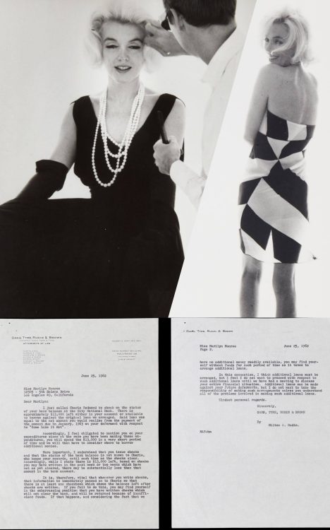 Two 1970s prints from Marilyn’s 1962 Vogue layout with Stern; and a typed letter from Milton Rudin, Marilyn’s lawyer (and brother-in-law to her psychiatrist, Dr. Ralph Greenson.) The letter is regarding her bank balance, with Rudin admonishing her that ‘at the rate you have been making those expenditures, you will spend the $13,000 in a very short period of time.’