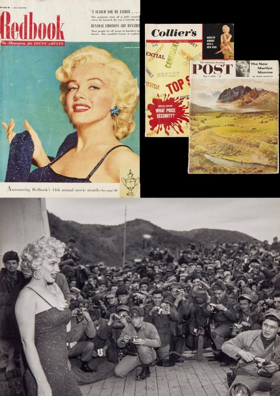 Redbook, March 1953 – Nickolas Muray’s photo illustrates a cover story on the magazine’s 14th Annual Movie Awards, with Marilyn named as Outstanding Personality of the year; and a photo from her 1954 tour of Korea, when she wore the same Ceil Chapman dress. Marilyn also appears in these two cover insets: Collier’s, July 9, 1954 – includes a 4-page article by Robert Cahn, about Marilyn’s work with jazz pianist Hal Schaefer as she rehearsed songs for There’s No Business Like Show Business, with photos by John Florea; and Saturday Evening Post, May 5, 1956 – featuring ‘The New Marilyn Monroe,’ a 6-page article from a serialised interview with Pete Martin, later published in full as Will Acting Spoil Marilyn Monroe?