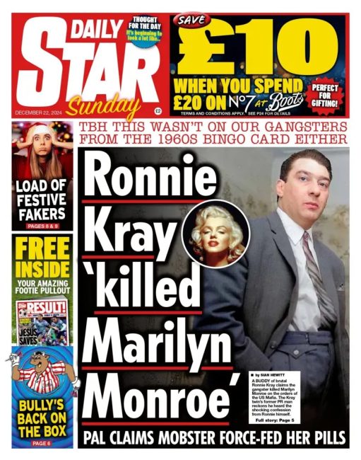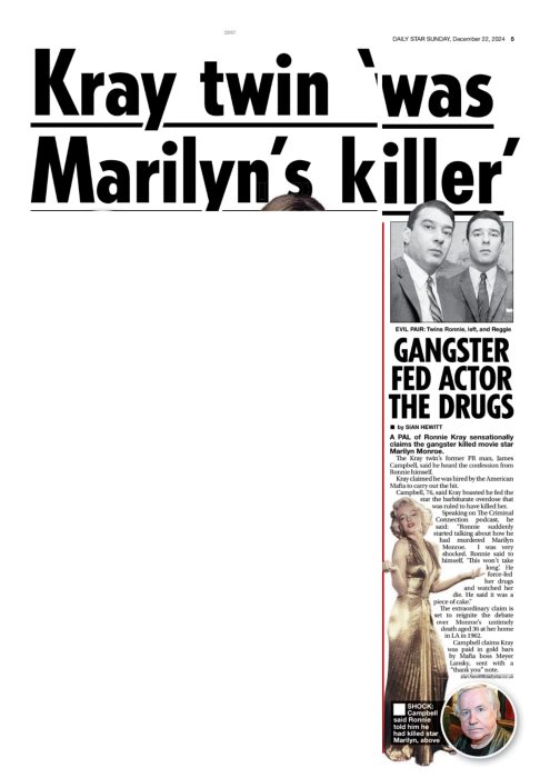 Marilyn landed on the front page of the UK’s Daily Star today, with what may be her strangest headline story this year. James Campbell, a ‘former PR man’ to the Kray twins – the East London gangsters whose reign of terror spanned the 1960s – has made an extraordinary claim about the elder twin, Ronnie Kray.