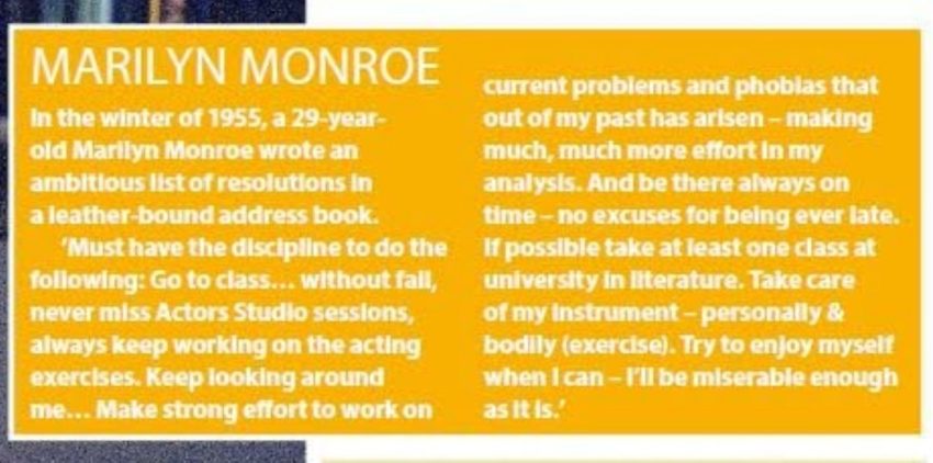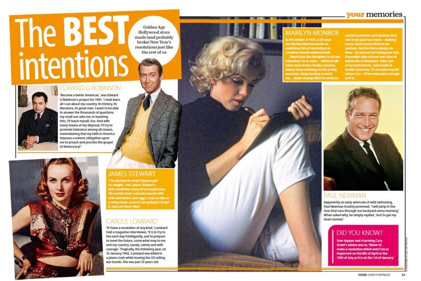 Marilyn is featured in the latest issue of Yours magazine (dated January 7, 2025, with Fern Britton on the cover) in an article about the new year’s resolutions of old Hollywood stars. Although undated, this handwritten list was found in one of Marilyn’s address books, dating from around the time she moved to New York in 1955.