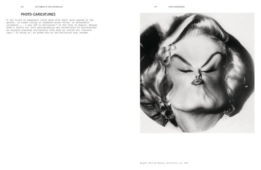 One of Weegee’s photo manipulations, introducing a chapter on Hollywood, is based on his best-known shot of Marilyn arriving at Idlewild Airport (now JFK Airport) on September 9, 1954. The original image – used on a book cover in 1979 – embodies the trope of a glamorous star blowing kisses to her adoring public.