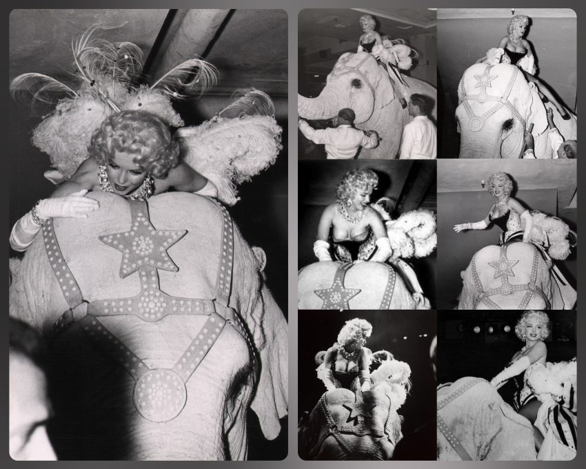 A rather awkward Weegee photo of Marilyn climbing onto a pink elephant (during a 1955 charity circus at Madison Square Garden) was featured in the 2019 exhibition, New York Stories.