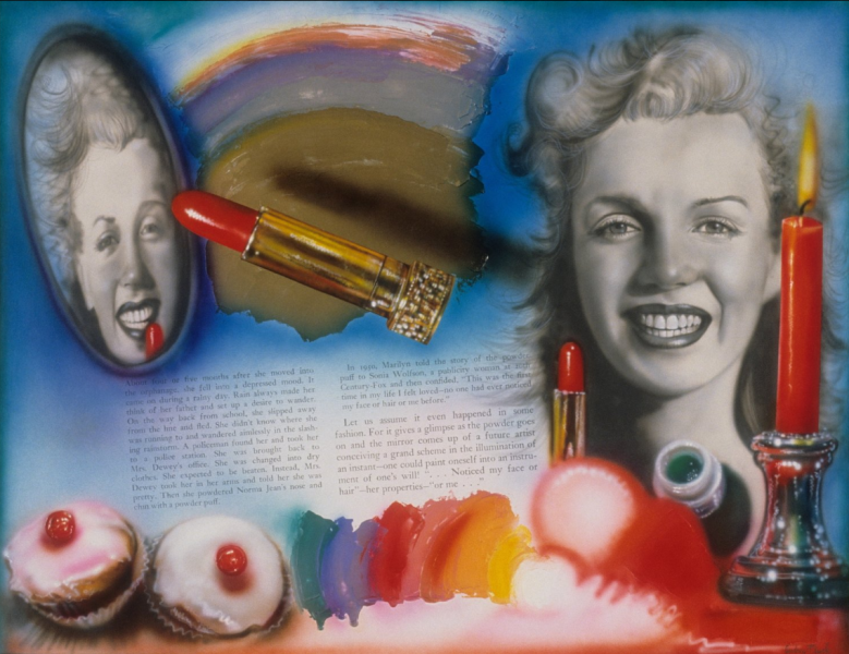 Flack shows that there is a natural progression from Mailer’s text (which is about Monroe’s childhood discovery of makeup), to the photograph of Monroe (which represents what the actress has made of herself for the camera), to the whole painting’s vision of the need for self-definition, the need for one artist to inspire another artist to inspire another artist, and so on. By depicting Monroe’s reflection in a domestic context – in a dressing-table mirror – Flack forces us to probe our own desire for recognition, so that we can see ourselves in a larger world. Monroe’s distorted image (notice how her face takes on the shape of the oval mirror) makes manifest the ways in which the self’s own shape is twisted, magnified, elongated, and blurred in the process of reproduction. Although this painting is very specifically about one woman’s replicated life, it can also be read as the story of the underlying motivations that drive all people to be creative, to fashion the largest possible sense of themselves.”