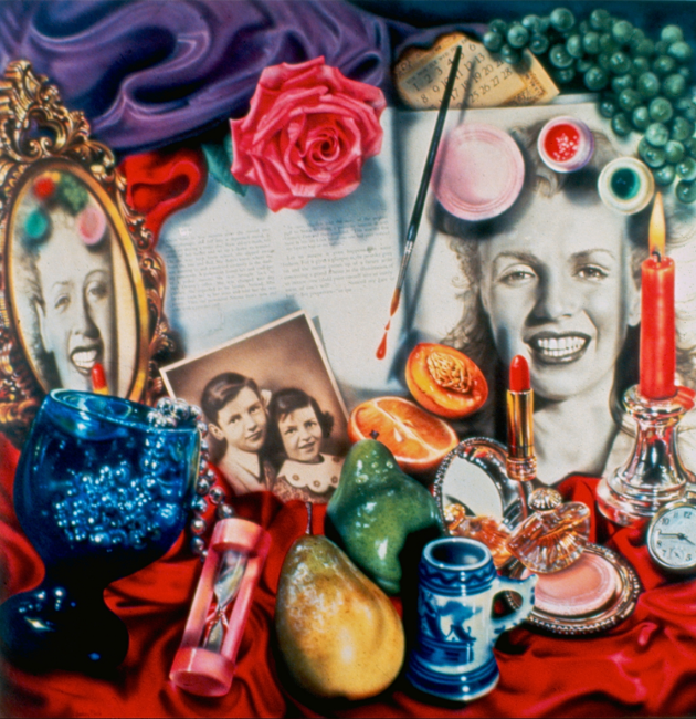 “Marilyn narrates Monroe’s life in the sense that she faces us as an image … Her expression is enthusiastic, but this is truer of the original photograph than of the painting, for Flack has lined Monroe’s brow with a slight trace of pain. The calendar is turned to August, the month of Monroe’s suicide, and the black end of the paintbrush points to the day she died. The flower, the fruits, the luxuriance of the drapery, the bold colours – especially the reds – evoke memories of the colour schemes of Monroe’s movies and of her photographs, especially the nude calendar shot of 1949. But these are Flack’s colours as well, colours that dominate many of her other paintings and that are especially prominent in her Vanitas series, of which Marilyn is a part. The point of Vanitas, Flack explains, is to ‘encourage the viewer to think about the meaning and purpose of life.’ The meaning of Flack’s life is also indicated by her inclusion of a photograph of herself as a child and by the paintbrush with its drops of paint on the paperback text of Norman Mailer’s biography of Monroe …