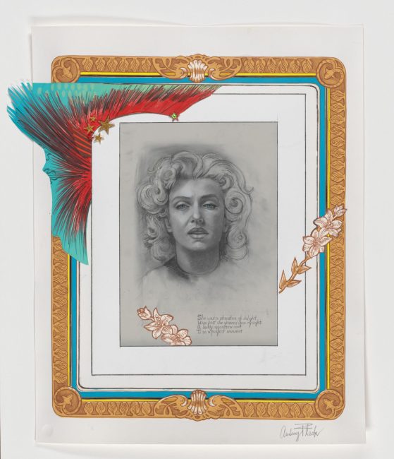 An accomplished banjoist, Audrey released an album with her History of Art band in 2012. Her 2015 exhibition, Heroines, featured a ‘transcendent drawing’ of Marilyn. Based on a 1953 photo shoot with Ben Ross, the portrait shows a tougher Monroe. The pencil drawing is framed in gold and decorated with feathers, and lines of verse by the Romantic poet, William Wordsworth (‘She was a phantom delight …’)