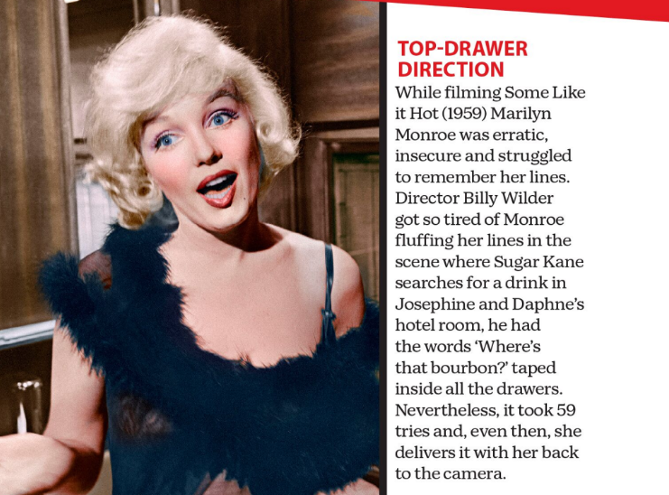 Alongside Charlie Chaplin’s 342 takes for one scene in City Lights (1931), or Shelley Duvall’s 127 takes in The Shining (1980), Marilyn’s alleged 59 retakes of a single line (‘Where’s that bourbon?‘) for Some Like It Hot (1959) seems quite mundane – although numbers vary depending on who’s telling the story.