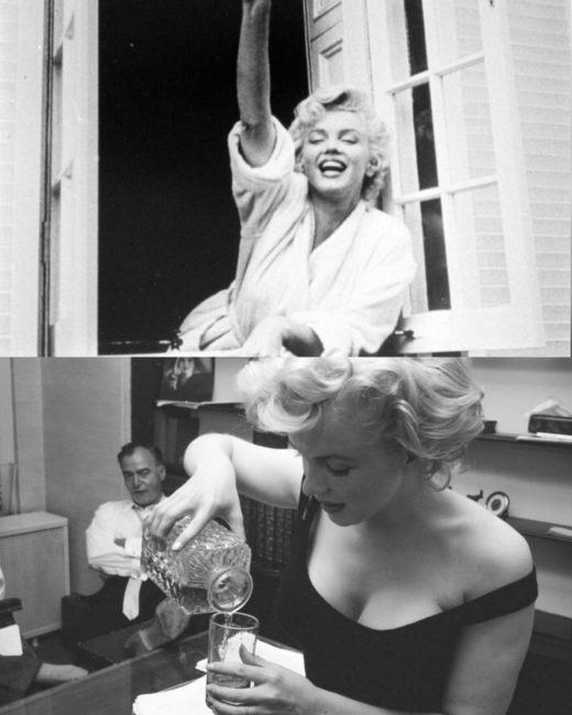 And finally, two more relaxed shots of Marilyn: firstly, Yale Joel captured her waving to the crowd from inside the window of a brownstone house on East 61st Street, NYC, during filming of The Seven Year Itch in 1954. And in 1958, Robert Kelley photographed Marilyn in her East 57th Street apartment, pouring drinks for theatre producer Kermit Bloomgarden and Miller, seated off-camera.