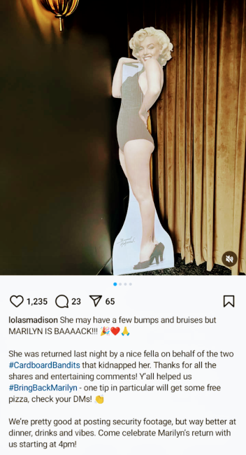 A cardboard standee of Marilyn was stolen from Lola’s Hi/Lo Lounge in Madison, Wisconsin this week, as WMTV reports. However, CCTV footage of two women removing the standee swiftly went viral – and after three days on the lam, it has now been returned by a good Samaritan.