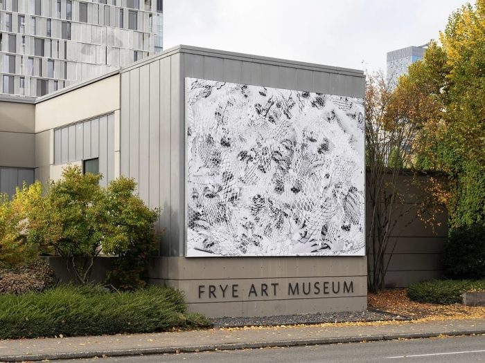 The Boren Banner Series reflects the museum’s commitment to showcasing work by Pacific Northwest artists. This biannual series gives regional artists the opportunity to present a piece as a monumental, 16 x 20 ft. vinyl ‘banner’ alongside an exhibition of related works inside the museum. The billboard-size artwork is prominently sited facing Boren Avenue, the Frye’s most visible and accessible physical interface.”