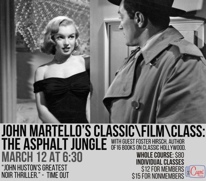The Asphalt Jungle – which turns 75 this spring – is showing at the historic Capri Theatre in Montgomery, Alabama on Wednesday, March 12, at 6:30 pm, as part of John Martello’s Classic\Film\Class series.