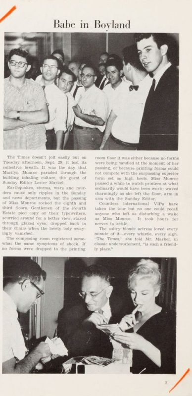 “The Times doesn’t jolt easily but on Tuesday afternoon, Sept. 29, it lost its collective breath. It was the day that Marilyn Monroe paraded through the building inhaling culture, the guest of Sunday Editor Lester Markel.