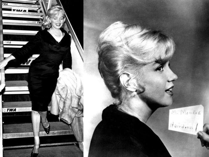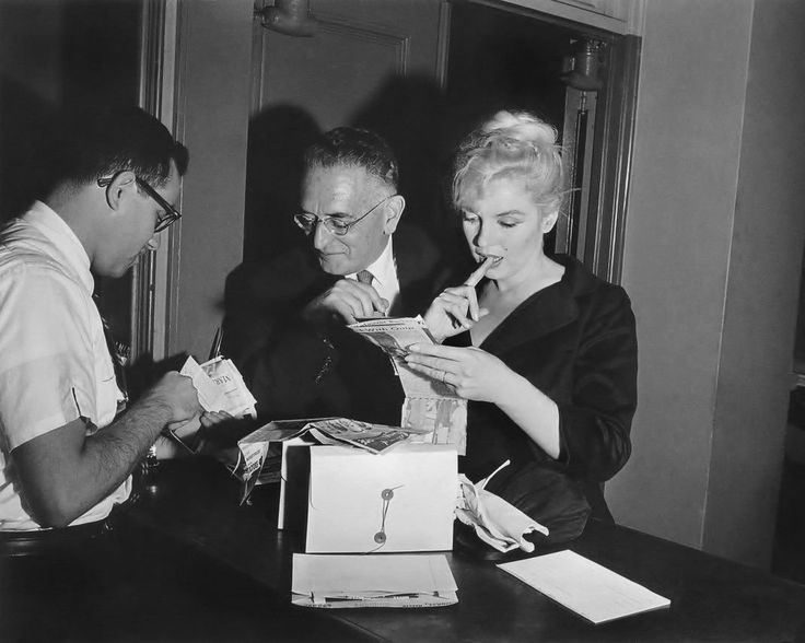 Could one of the adoring male faces in the accompanying photos be Bob Medina’s? Lester Markel is shown next to Marilyn here, with another man behind the desk. Marilyn’s hair is worn in a chignon, similar to how it would appear in test shots for Let’s Make Love (1960), and in The Misfits; while her outfit resembles the black suit she had worn at Idlewild Airport when boarding a flight to Los Angeles for Soviet premier Nikita Khrushchev’s visit to Twentieth Century-Fox on September 19.