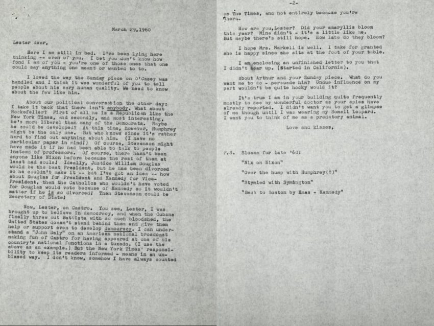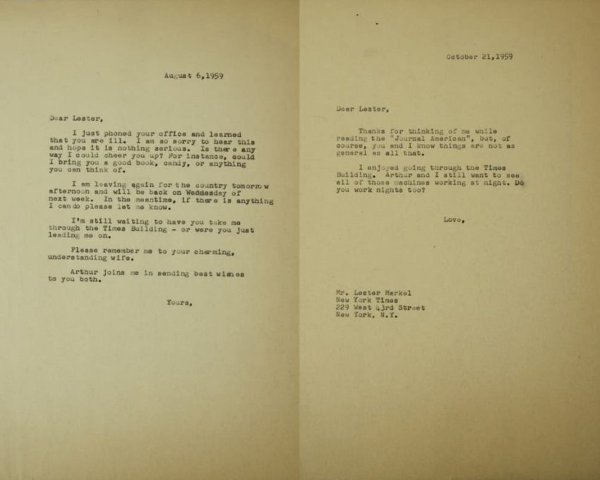 And finally, Marilyn’s friendship with Lester Markel preceded her Times visit, as seen in correspondence sold at Julien’s Auctions in 2016. (Interestingly, an offhand remark from Marilyn suggests she wasn’t initially as enamoured of JFK as the gossip-mongers would have us believe …)