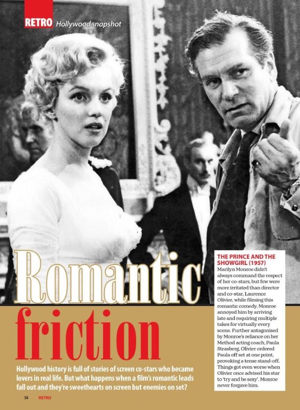 Marilyn’s fraught relationship with Laurence Olivier, her director and co-star in The Prince and the Showgirl (1957), heads up a 3-page story on battling screen couples in the April issue of Yours Retro (#86, with Gregory Peck on the cover.)