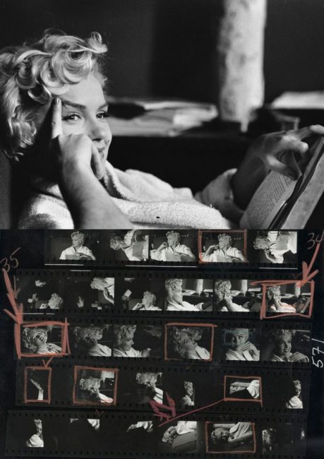 The exhibition is accompanied by a book, WOMEN POWER, edited by curators Walter Guadagnini and Monica Poggi. Shown above, Marilyn shooting another Misfits scene, by Morath; and below, reading her Seven Year Itch script in a portrait and contact sheet by Erwitt.