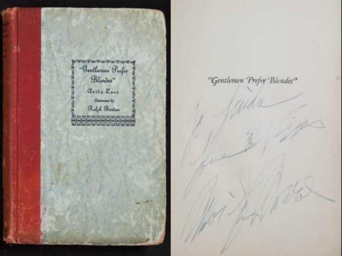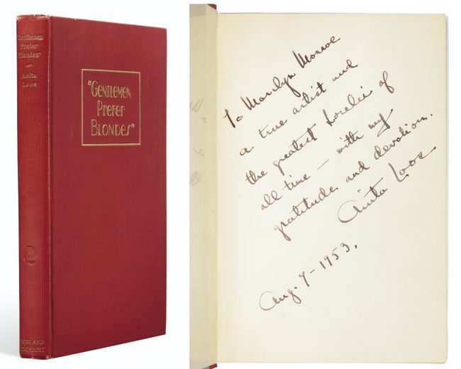 A first-edition copy inscribed by the author was sold for $16,250 at Christie’s in 1999, as part of the estate auction, The Personal Property of Marilyn Monroe. The inscription reads thus: ‘To Marilyn Monroe/a true artist and the greatest Lorelei of all time – with my gratitude and devotion, Anita Loos.’