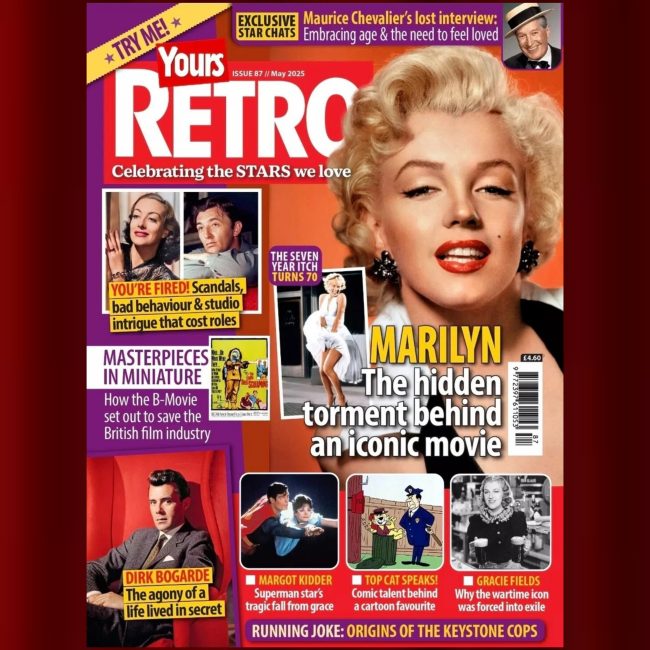 While a sultry headshot from Gene Kornman’s often reproduced 1952 photo shoot with Marilyn graces the cover of UK nostalgia magazine Yours Retro‘s May 2025 issue (#87), a colourised still from her most famous movie scene points to the real story, nearly 70 years after The Seven Year Itch first opened in June 1955.