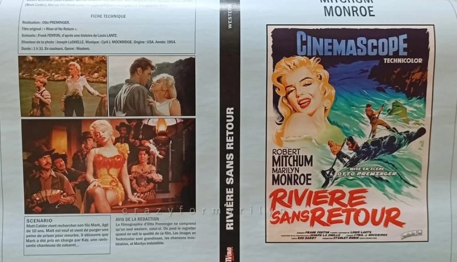 The video cover features a vintage French poster for La Rivière Sans Retour, plus screencaps from the original trailer, showing Marilyn with co-stars Robert Mitchum and Tommy Rettig; and a still photo from the film’s theme song, performed in the final scene.