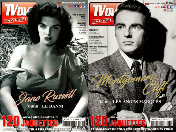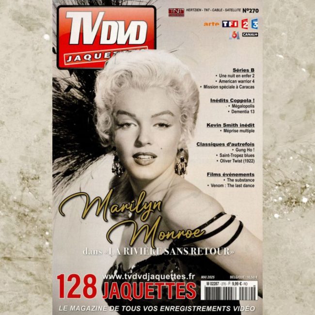 A publicity shot of Marilyn in River of No Return fronts the May issue of TV-DVD Jaquettes, a French magazine featuring pull-out covers for home videos. Frank Powolny‘s studio portrait shows Marilyn as saloon singer Kay, costumed for ‘One Silver Dollar’, her opening number in Otto Preminger’s Western.