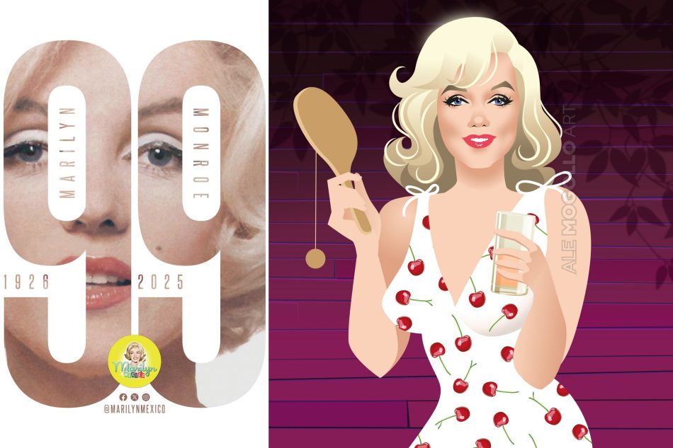 Marilyn Mexico sent greetings with a Bert Stern-inspired numeric; and Spanish artist Alejandro Mogollo unveiled Marilyn playing paddle-ball in her ‘cherry dress’ from The Misfits – also featured in his latest monograph (see here …)