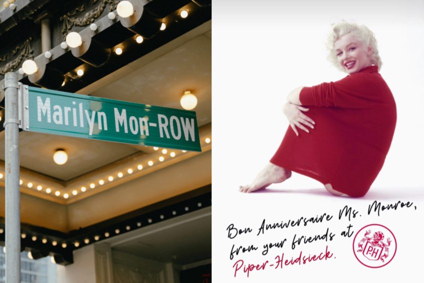 On Broadway, the SMASH cast renamed West 45th Street ‘Marilyn Mon-ROW‘; and across the ocean, Piper-Heidsieck toasted Marilyn, who favoured their champagne.