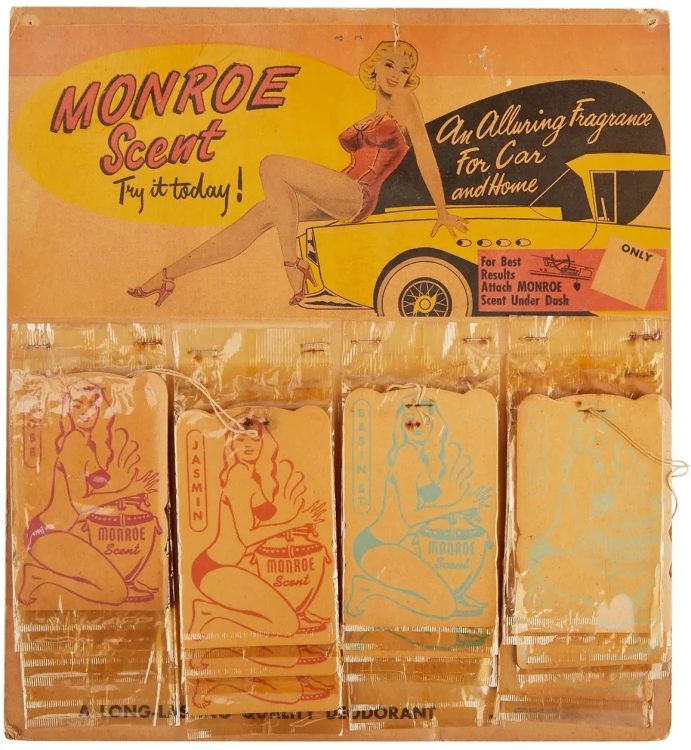 This cardboard countertop display for ‘Monroe Scent,’ a range of air fresheners, was produced in 1954, with artwork evoking Marilyn’s How to Marry a Millionaire era. Although the smallprint mentions a ‘Monroe Mfg. Co.,’ Marilyn never endorsed this product – and may not even have known of its existence.