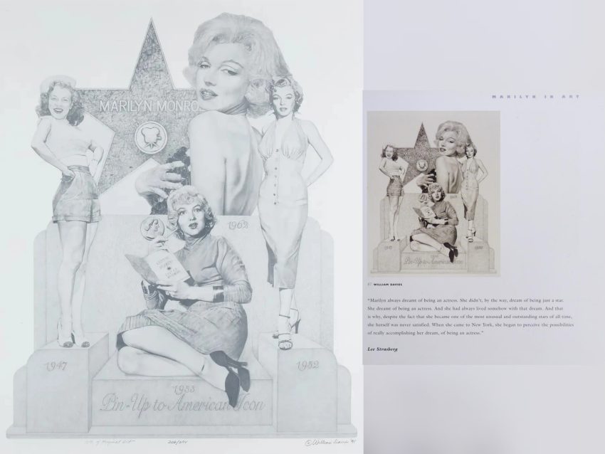 ‘Pin-Up to American Icon’, a 1998 limited edition print signed by artist William Davies, depicting Marilyn’s Hollywood Star among four different vignettes from her early modelling days to leading lady of Niagara and Gentlemen Prefer Blondes, and her 1962 Vogue shoot with Bert Stern. One of several greyscale works by Davies also published in Roger G. Taylor’s book, Marilyn In Art.