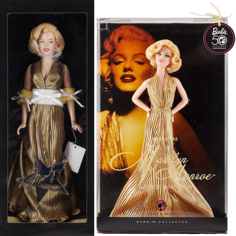 Sold separately, two dolls depicting Marilyn in her gold lamé dress from Gentlemen Prefer Blondes: at left, a 1990s ‘Portrait Doll’ from Franklin Mint ($325); and at right, ‘Blonde Ambition’ – from a 2008 collection celebrating 50 years of Barbie ($520.) This auction also features several more dolls and figurines, inspired by Marilyn’s photo shoots with Philippe Halsman and Milton Greene; costumes from The Seven Year Itch and Some Like It Hot; her green beaded gown from the 1962 Golden Globes; and the Happy Birthday Mr President dress.